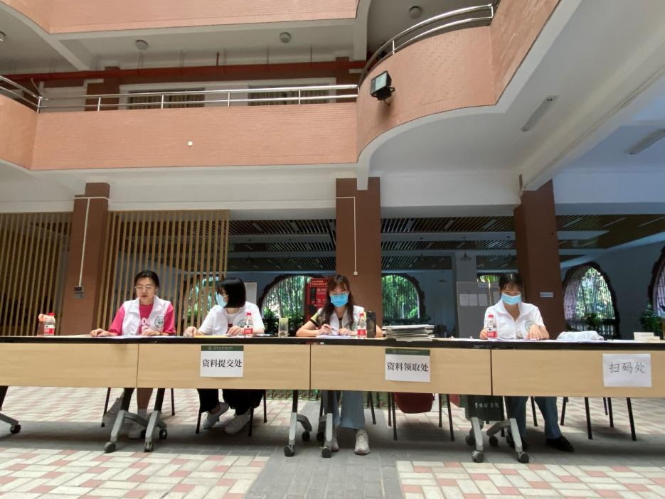 迎新工作组及志愿者们分工明确、各司其职,引领新生们完成现场扫码报到、物资发放、材料递交等步骤,有条不紊地帮助新生们高效、快捷地完成报到流程。