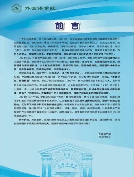 当前,“读懂中国”已成为国家对外话语体系构建的重要目标,提升对外传播能力,用外语讲好中国故事,对提升我国在国际社会的软实力和影响力有重要意义。国家外宣与国际传播能力提升显然都离不开外语专业复合型人才的培养。国家统筹加强外语能力建设,外语专业人才培养使命光荣,未来大有可为。本成果展春季新学期伊始开展可谓恰逢其时。它既彰显了学院的人才培养以习近平新时代中国特色社会主义思想为指导,以“中国立场、世界眼光”为方针,又展现了学院在三全育人方面的成果、成效。更重要的是,通过“大创”项目的成功实施,凝聚了人心,增进了共识,汇聚了力量,有力地推动了学院人才培养、科学研究和学科建设再上新台阶。“大创”成果展将成为2022年一个美好的开始,激励全体师生员工以更加昂扬的姿态奋进新征程、建功新时代,共同创造外国语学院更加美好的明天。