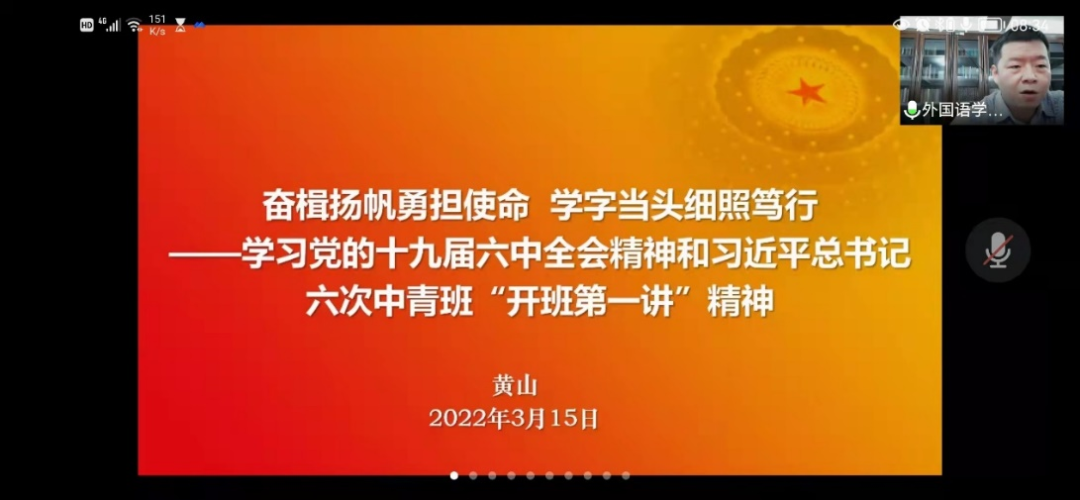 3月15日,外国语学院党委书记黄山面向我院第七期“青马学堂”学员,2021级入党申请人、入党积极分子讲授了题为“奋楫扬帆勇担使命 学字当头细照笃行——学习党的十九届六中全会精神和习近平总书记六次中青班‘开班第一讲’精神”的思政课。讲座采取线上形式进行,由学院团委书记林璐主持。