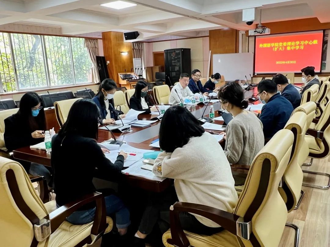 4月20日上午,外国语学院党委理论学习中心组举行扩大会议,结合《中山大学2022年4月二级党组织理论学习中心组学习和党支部组织生活要点》,重点学习了习近平总书记在中央政治局常委会会议、北京冬奥会冬残奥会总结表彰大会、中央全面深化改革委员会第二十四次会议等的重要讲话精神。党委理论学习中心组成员、全体班子成员、院长助理、师生党支部书记等出席会议。会议由学院党委书记黄山主持。