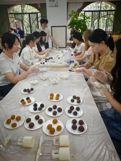 活动伊始,学院准备的丰富物料就已整齐摆放:雪白的饼皮,精心挑选的各式馅料与精美的模具一应俱全。在学生志愿者的耐心指导下,师生们纷纷戴上一次性手套,学习制作冰皮月饼。从饼皮的擀制、馅料的包裹,到模具的压花成型,大家都兴致勃勃、专心致志地投入月饼制作活动。其中,不少同学是第一次亲手做月饼,虽手法略显生涩,却满怀热情,将祝福与心意一点点揉进香甜的馅料中。小小的月饼,在此刻不仅是应节的美食,更是连接情谊、传递温暖的纽带,让团圆的寓意在动手实践中变得真实可感。这是对传统节日的致敬,也是一次极具意义的劳动教育。