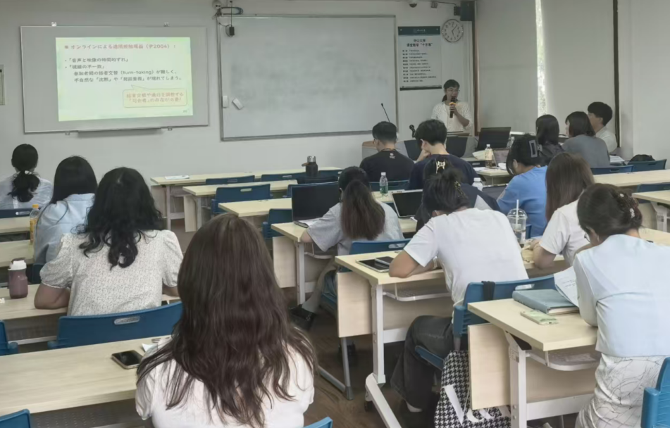 “会话数据分析与教材开发·课堂实践·实践研究”侧重实例解析与方法示范。作为日语会话分析领域的资深学者,中井教授以线上中日交流活动和日语教学实践为例,生动展现了研究与实践如何相互促进、形成良性循环。通过展示从初期探索到逐步完善的实际案例,她揭示了根据实践反馈调整研究方法的重要性和可操作性。随后,在中井教授指导下完成研究的硕士研究生张晓雪、博士研究生夏雨佳分享了基于会话分析方法的论文写作经验,包括数据收集与论文撰写过程,为在座本科生和研究生提供了宝贵的参考。讲座尾声,中井教授再次组织互动环节,邀请师生分享作为非母语者在外语会话中遇到的困难及应对策略,并启发大家思考如何将研究与实践更紧密地结合。