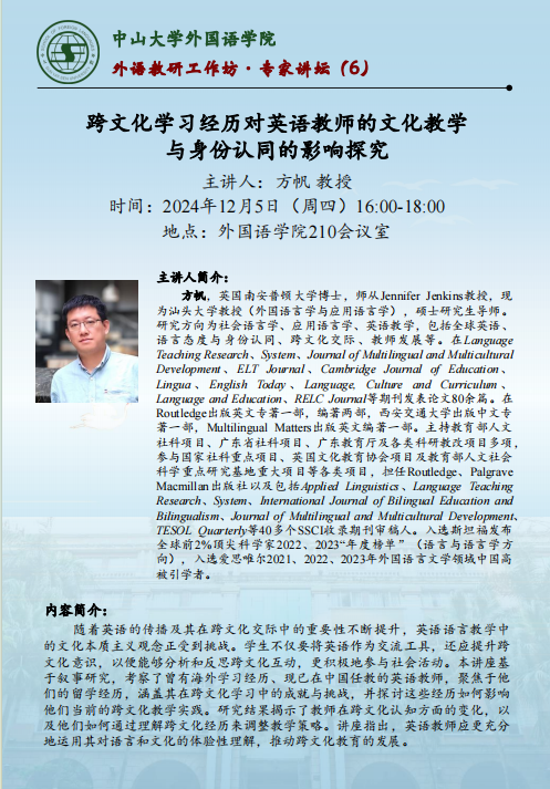 导航痕迹 中山大学外国语学院 跨文化学习经历对英语教师的文化教学与身份认同的影响探究 扫描此二维码分享 跨文化学习经历对英语教师的文化教学与身份认同的影响探究 发布人:罗锦芬 发布日期:2024-11-12 活动时间 2024年12月05日 16:00 - 2024年12月05日 18:00 活动地址 外国语学院210会议室