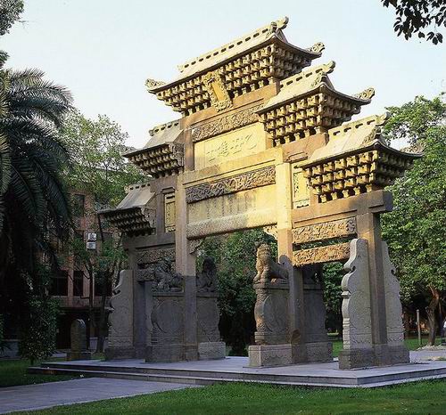 Eigentlich befand sich das Tor anfangs nicht hier, sondern in „Sipailou“, einem alten Stadtbezirk von Guangzhou. Im Jahr 1947 wollte die Stadtregierung die Straße erweitern, deswegen entschied man sich, das Gedenktor an einer anderen Stelle aufzustellen. Der Umzug war erfolgreich, aber leider wurde das Tor während der Kulturrevolution fast zerstört. Glücklicherweise konnten jedoch die meisten Bestandteile bewahrt werden. Im Jahr 1999 spendeten Absolventen der Universität über 700.000 Yuan für den Wiederaufbau des Tors. Deswegen können wir bis heute noch zu dem Gedenktor aufblicken. (Geschrieben von HAN Jingyi)