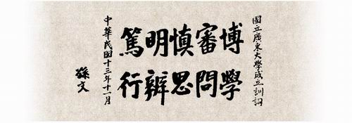 Als die Universität im Jahre 1924 von Dr. Sun Yat-sen gegründet wurde, schrieb er für die Universität folgendes Universitätsmotto nieder: "Umfangreiches Wissen aneignen, überlegte Fragen stellen, sorgfältig nachdenken, das Wahre erkennen und aufrichtig handeln." Das Original des Mottos entstammt dem Buch „zhong yong“ (übersetzt als „Mitte und Maß“), einem klassischen Werk der chinesischen Literatur. (Geschrieben von Han Jingyi)