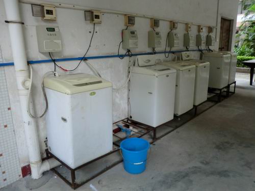 Es gibt meistens in der ersten Etage der Studentenwohnheime Waschsalons. Der Preis pro Wäsche beträgt nur 3 Yuan und ist nicht so teuer für die Studenten.